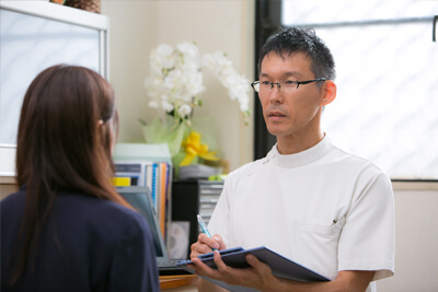 カウンセリングで、カラダの状態やいつからその状態で苦しんでおられるのかなど、くわしくお聞きして、専門の用紙に記載をしていきます。