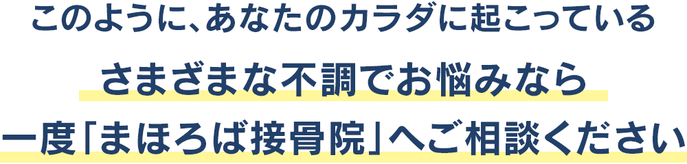 まほろば接骨院はスポーツによるケガや不調をはじめ、日常生活におけるケガ、交通事故の施術も専門としておりますので、カラダの悩みはどんな些細なことでも、お気軽にご相談ください。