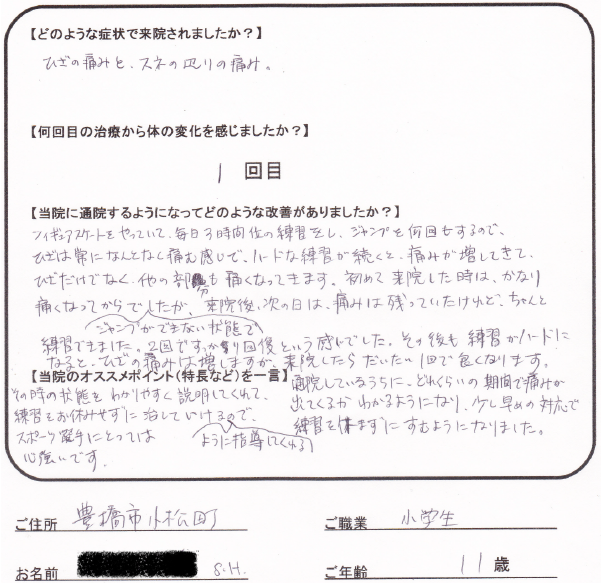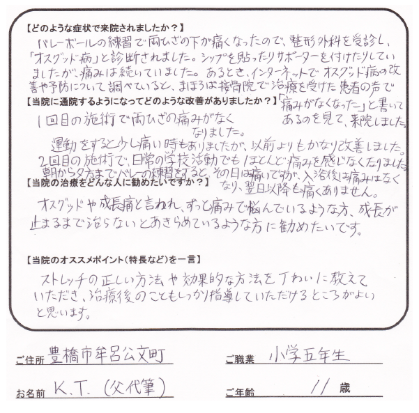 おかげで、オスグッドの痛みで練習を休まずに改善していけるのでスポーツ選手にとっては心強いです