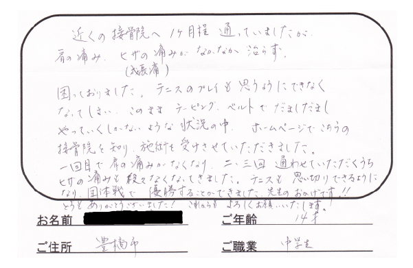 膝の痛みがなくなりテニスの団体戦で優勝することができました!